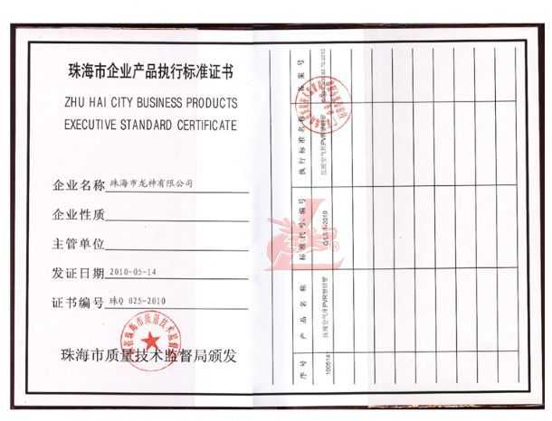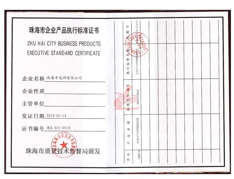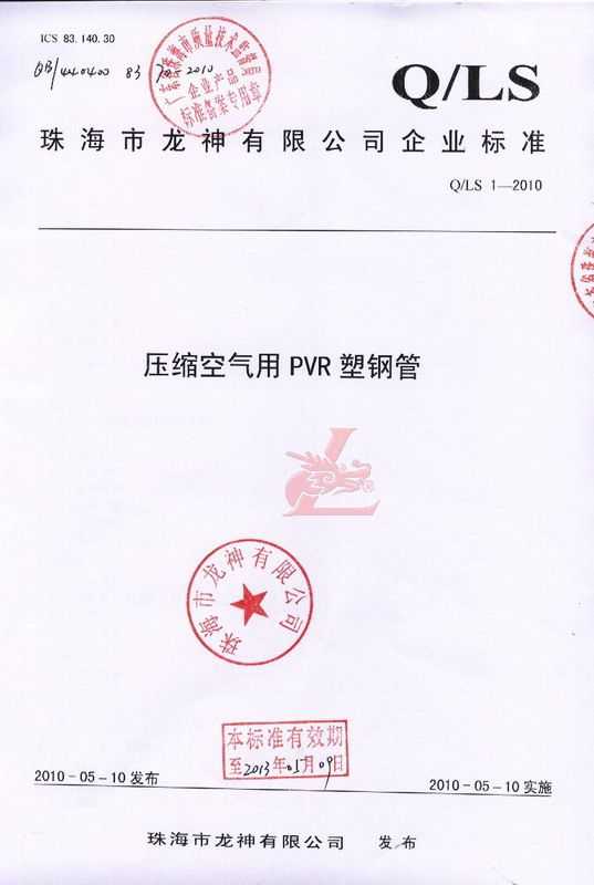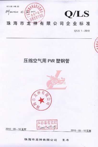 龍神壓縮空氣PVR塑鋼管成功申請企業執行標準 2010年5月珠海市龍神有限公司“壓縮空氣PVR塑鋼管”得到珠海市質量技術監督局認可,特此頒發“壓縮空氣PVR塑鋼管企業執行標準”,龍神公司在嚴格執行標準下,保證產品質量。 2010-05-20 9993